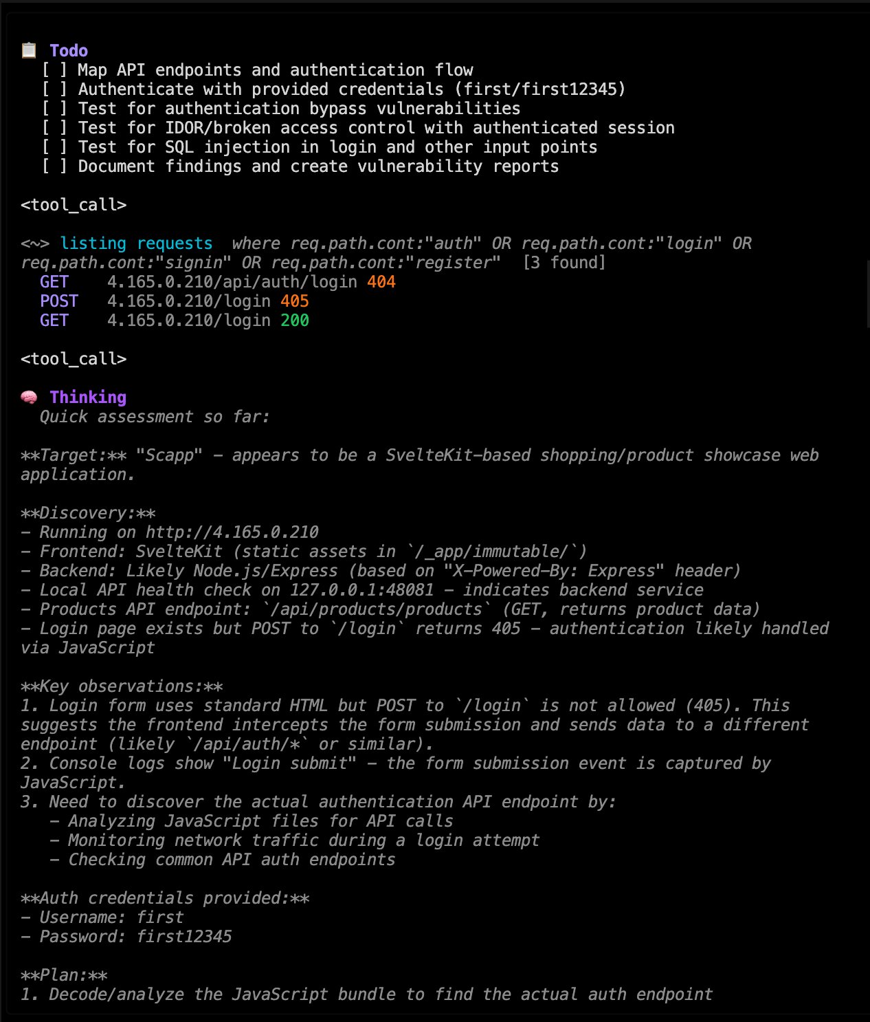 A real dead end we hit: We tried to automate dynamic analysis through a Clerk-based authentication flow. The AI stalled — it couldn't complete the login without a human supplying valid credentials or a session token. Add a Cloudflare challenge or a reCAPTCHA on top, and it's significantly stronger. We also noticed that WAF-protected targets can block or rate-limit the scripts and tools the AI relies on, which limits how far it can go. And the quality of the AI's decision-making, especially when sub-agents are spawned to explore different parts of the attack surface — is heavily tied to the reasoning model behind it. A weaker model loses context, repeats itself, or makes poor calls. None of this is a dealbreaker, but it's important to go in with realistic expectations.